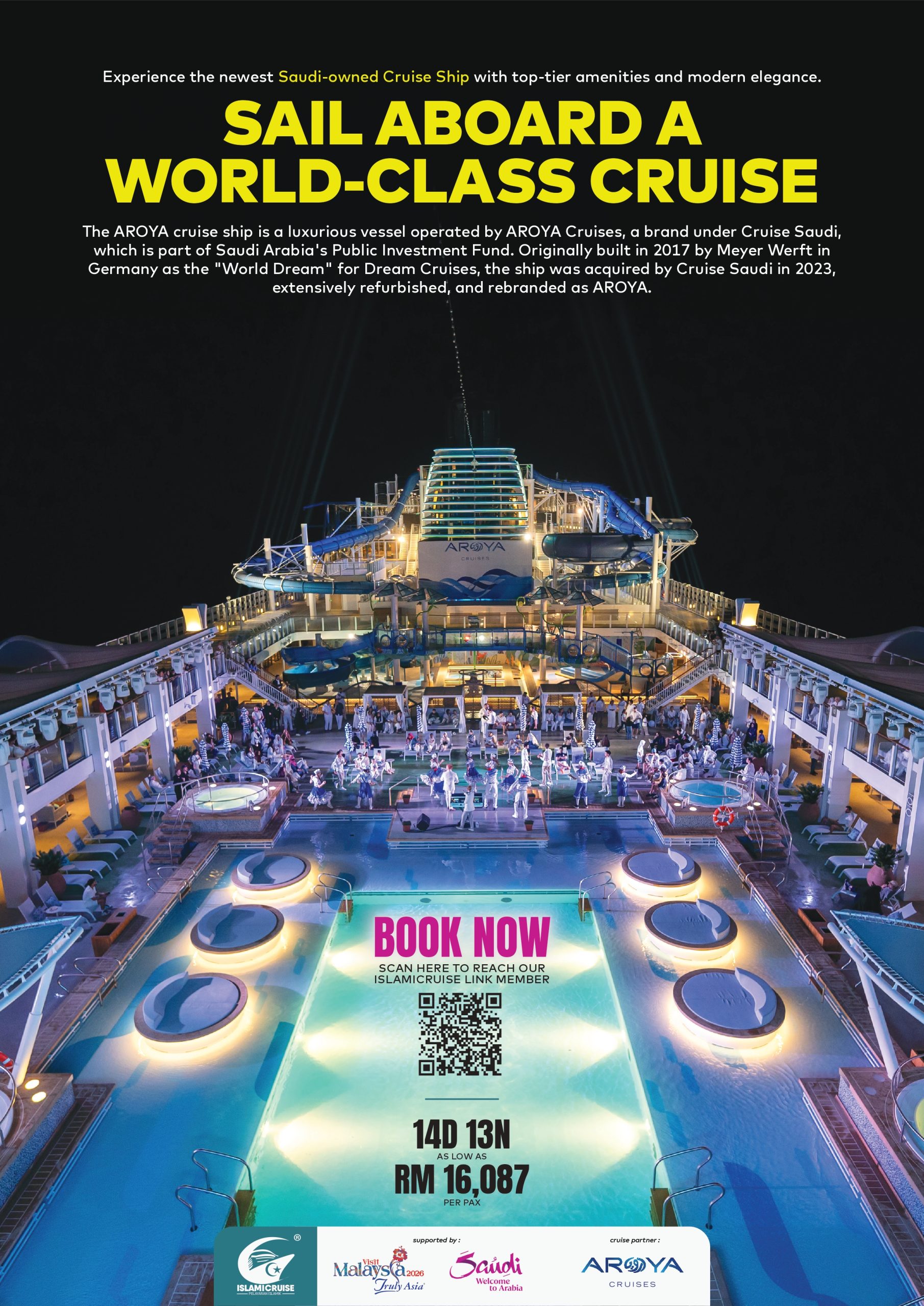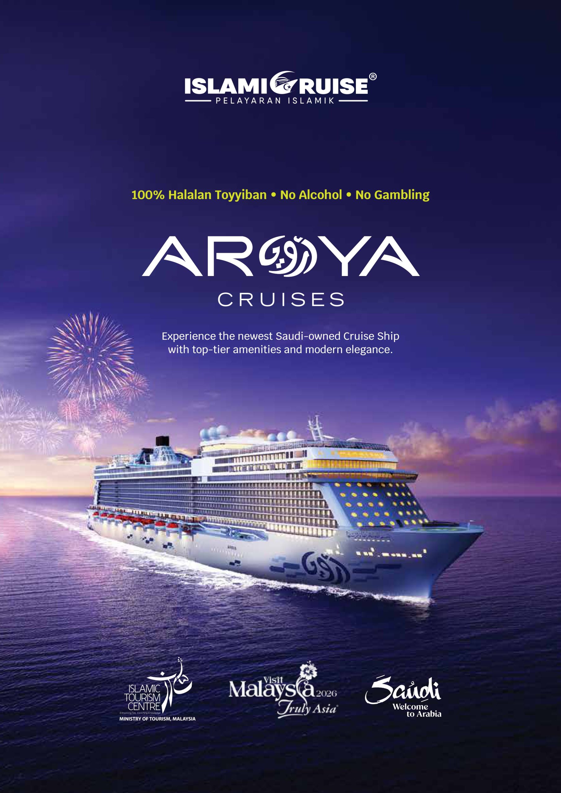 Pengalaman pelayaran patuh Syariah yang dikurasi oleh Aroya IslamiCruise dengan pengalaman eksklusif dan pelbagai aktiviti menarik. Sesuai untuk seisi keluarga dan rakan-rakan.