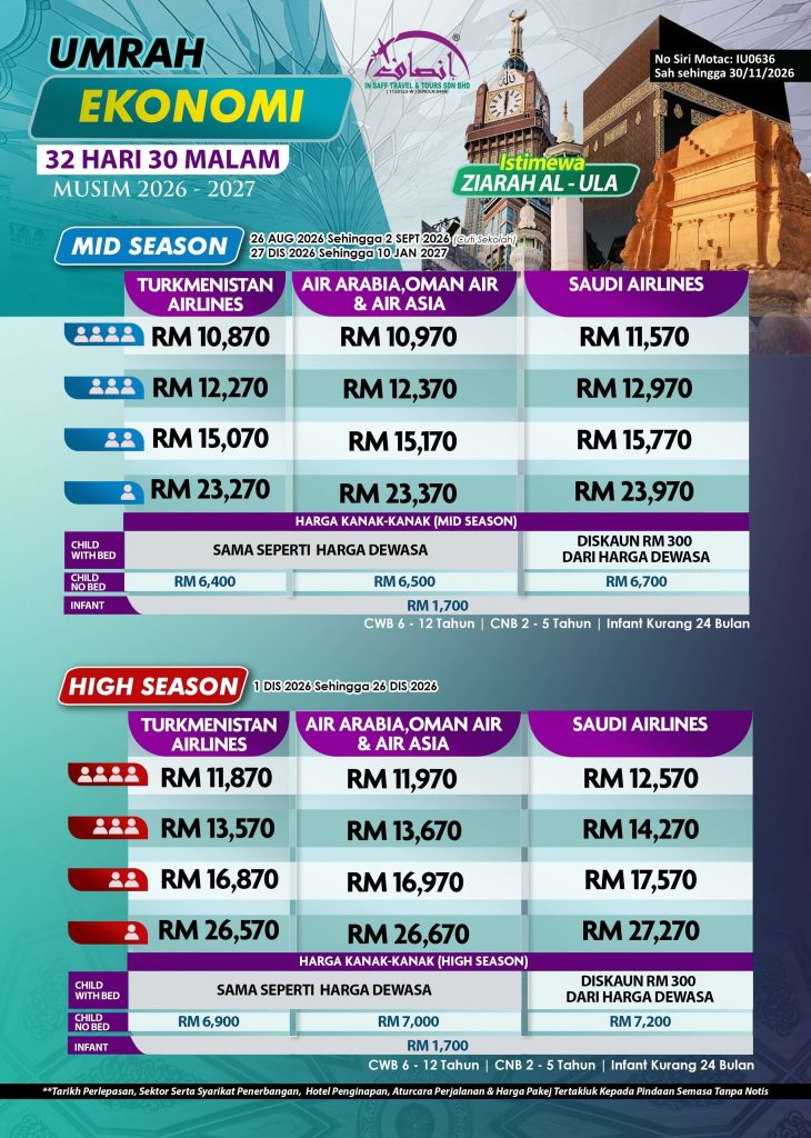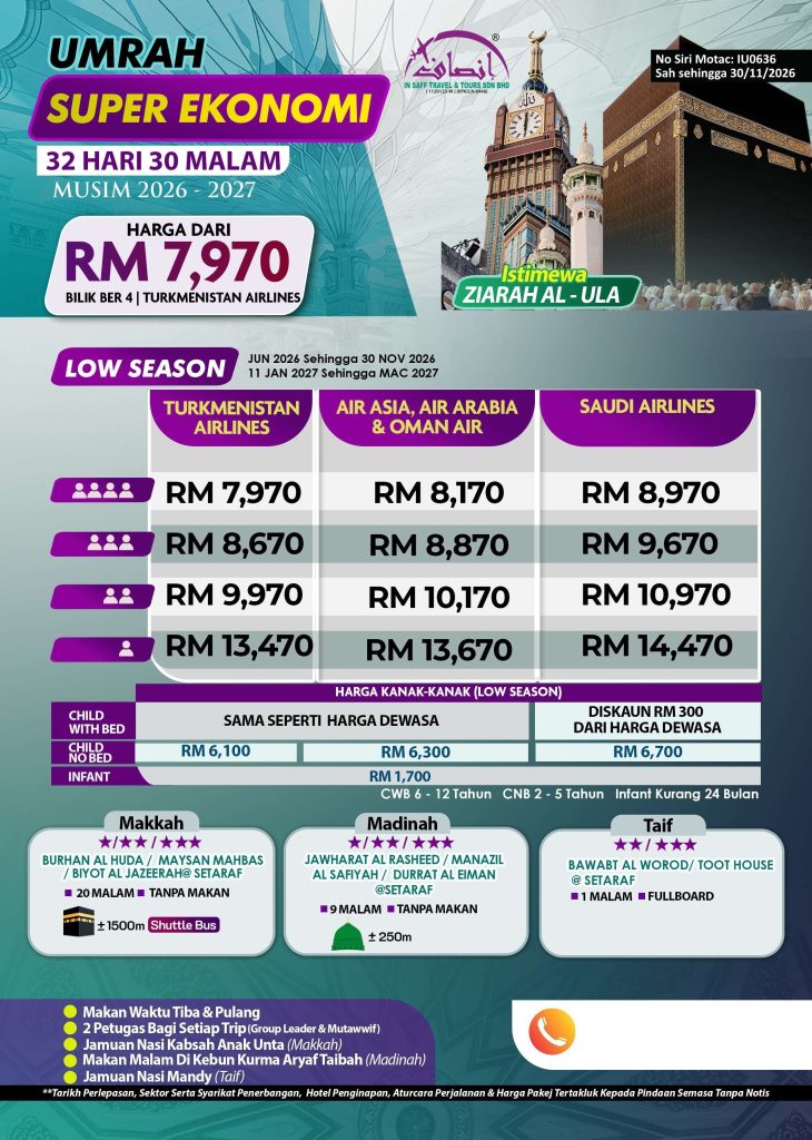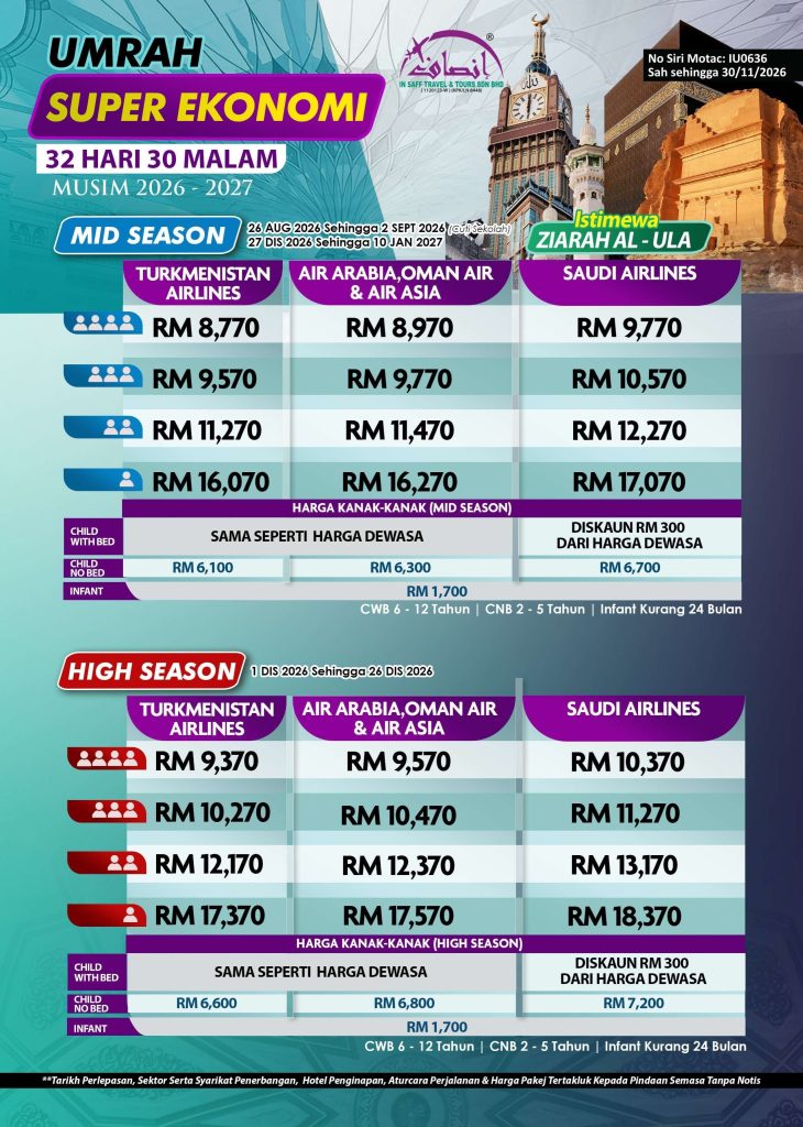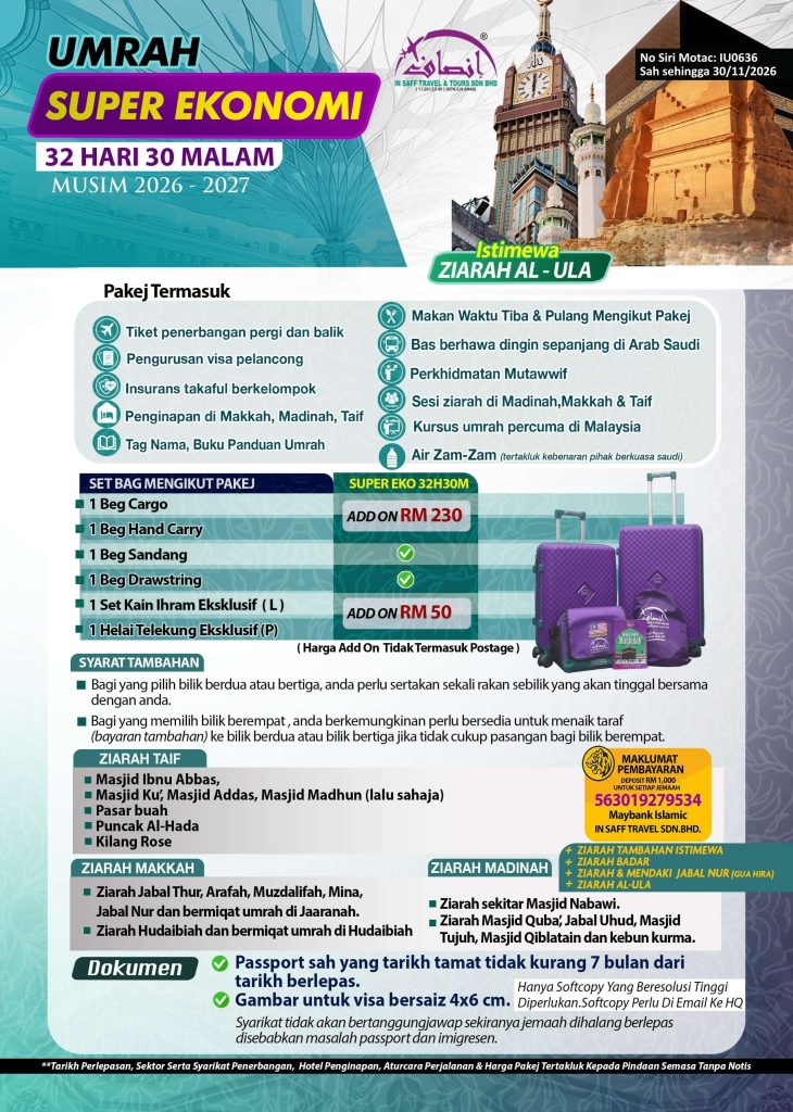 Lengkapkan ibadah anda dengan Pakej Umrah 32 Hari 30 Malam Super Eko, bermula dari hanya RM7,970. Dengan penginapan selesa di Makkah (19 malam), Madinah (10 malam), dan Taif (1 malam), pakej ini turut menawarkan pengalaman istimewa seperti ziarah ke Al Ula dan lokasi perang Badar, menjadikan perjalanan anda lebih bermakna.