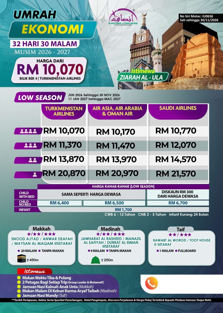 Alami perjalanan umrah yang lengkap dengan Pakej Umrah 32 Hari 30 Malam Ekonomi, bermula dari hanya RM10,070. Penginapan strategik di Makkah (19 malam) dan Madinah (10 malam), serta bermalam di Taif (1 malam), memastikan anda dapat menikmati keselesaan sepanjang ibadah.