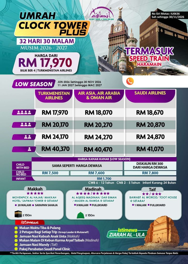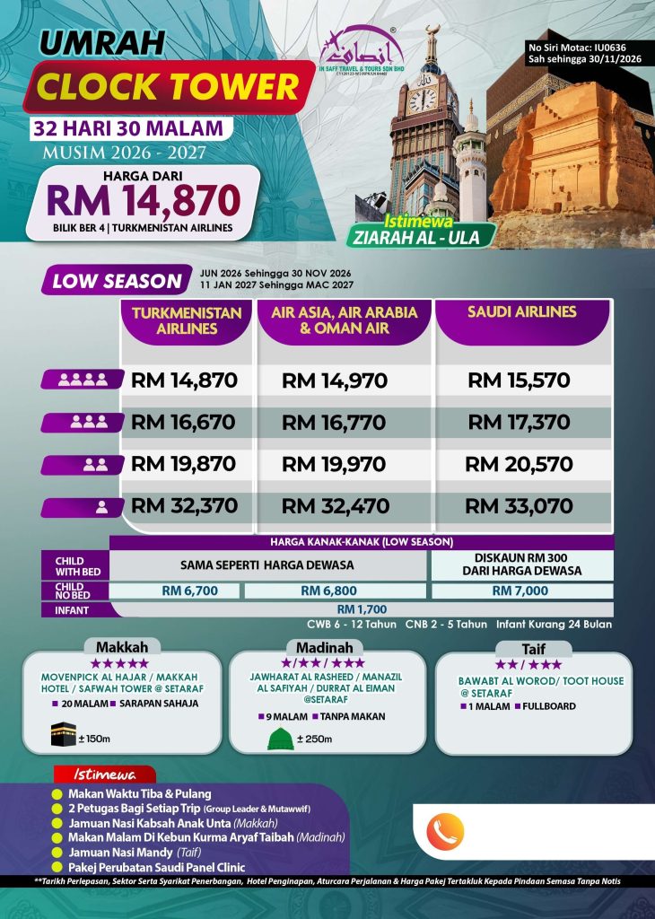 Alami perjalanan umrah yang luar biasa dengan Pakej Umrah 32 Hari 30 Malam Clock Tower, bermula dari RM14,570 sahaja. Dengan penginapan mewah di Pullman ZamZam atau Movenpick, Makkah (19 malam) yang hanya 50 meter dari Masjidil Haram, serta Ansar Al Madinah, Madinah (10 malam), anda akan menikmati keselesaan maksimum sepanjang ibadah. Tambahan bermalam di Taif (1 malam) melengkapkan pengalaman anda dengan suasana unik.
