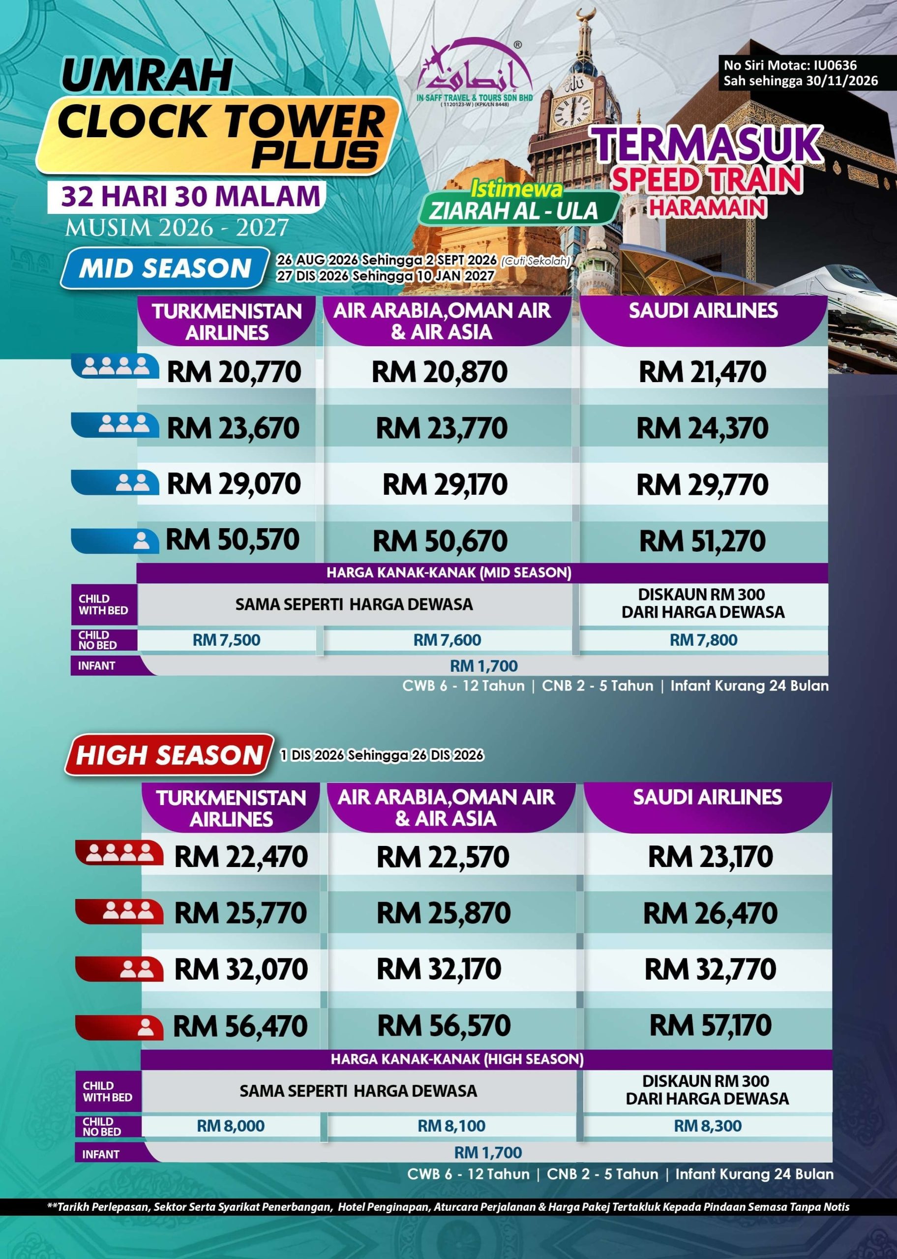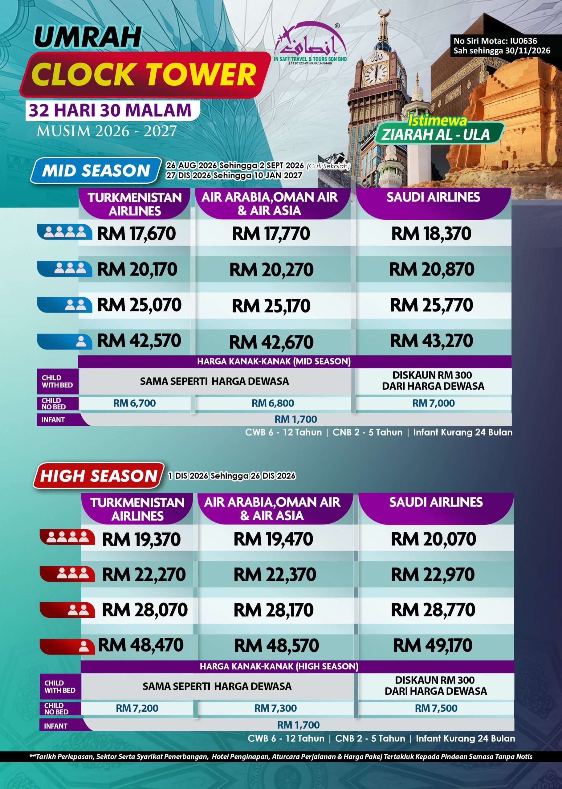 ** Tarikh Perlepasan, Sektor Serta Syarikat Penerbangan, Hotel Penginapan, Aturcara Perjalanan & Harga Pakej Tertakluk Kepada Pindaan Semasa Tanpa Notis
