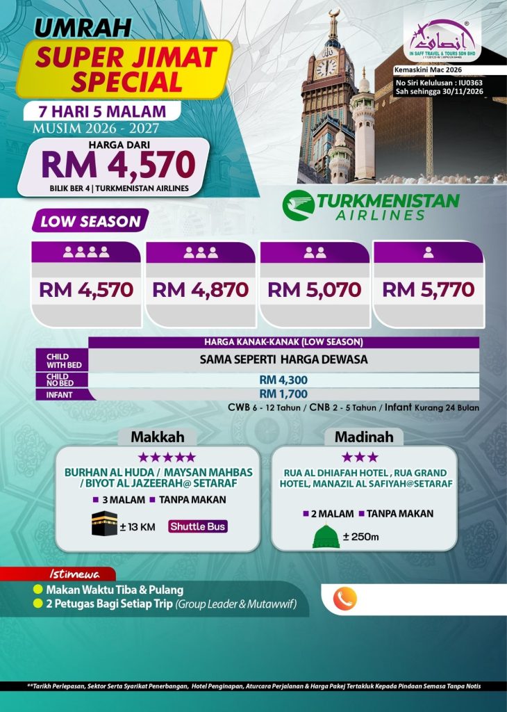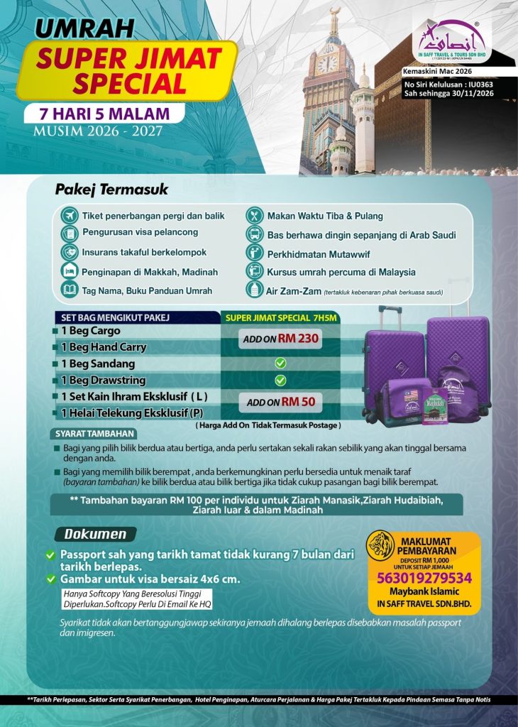 🌟 Pakej Umrah 7 Hari 5 Malam Super Jimat: Pilihan Terbaik untuk Ibadah Anda! Nikmati perjalanan ibadah yang lancar dan selesa dengan pakej istimewa kami bermula dari hanya RM4,570. Dengan penginapan strategik berhampiran Masjidil Haram dan Masjid Nabawi, kemudahan shuttle bus, serta bimbingan mutawwif berpengalaman, anda dapat menunaikan ibadah dengan penuh ketenangan.