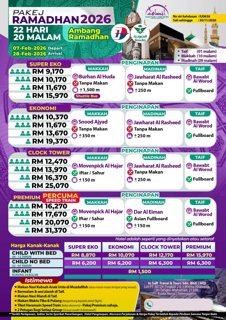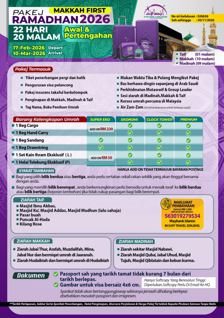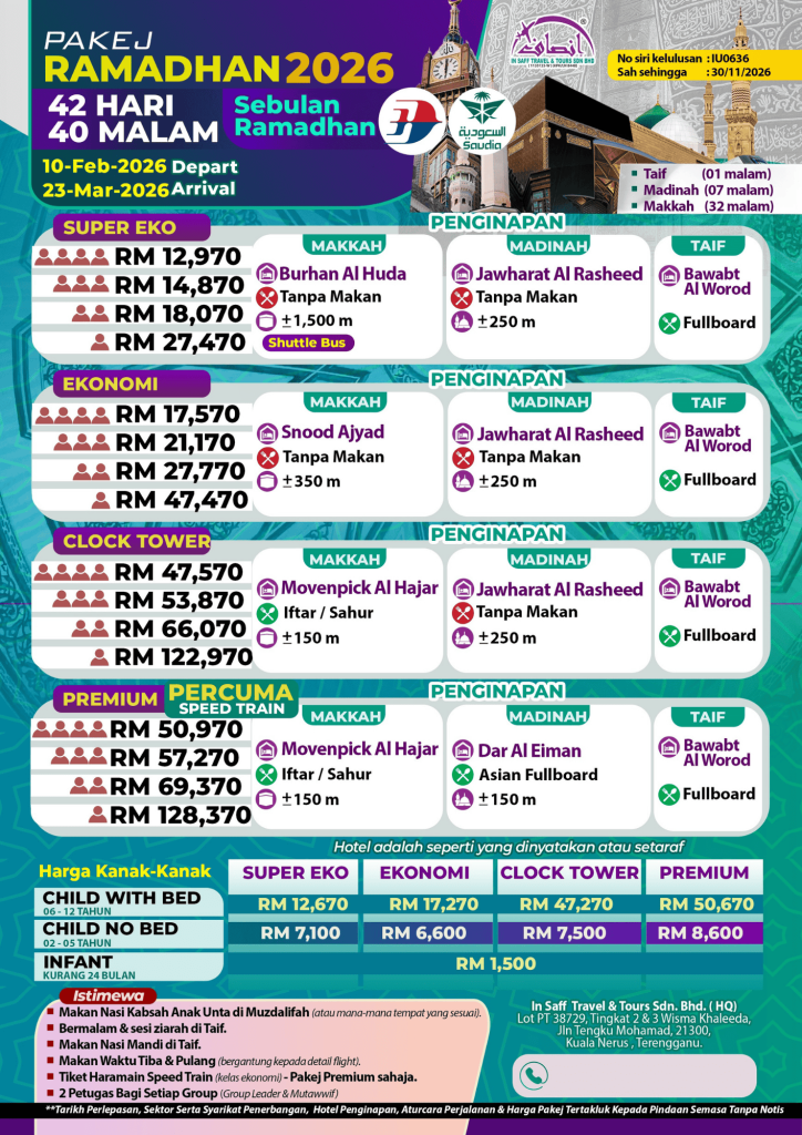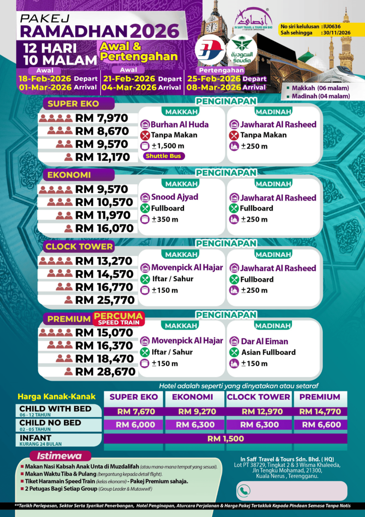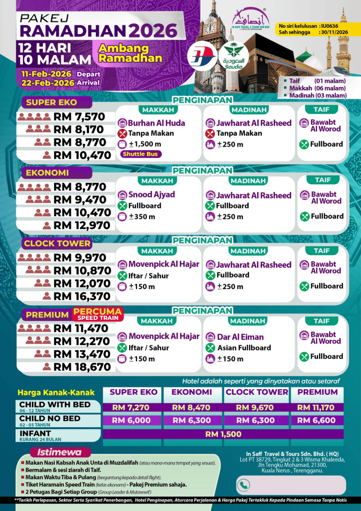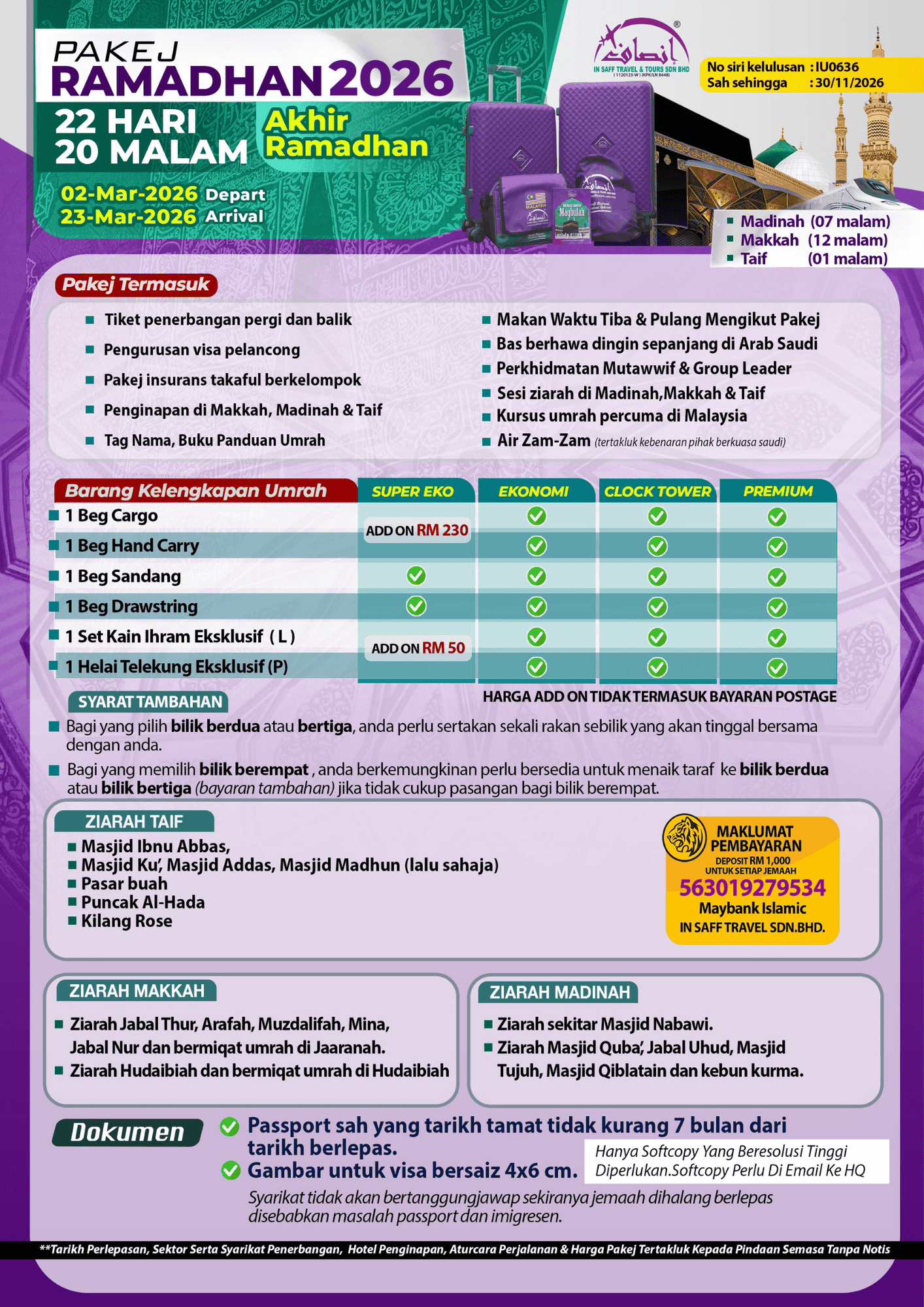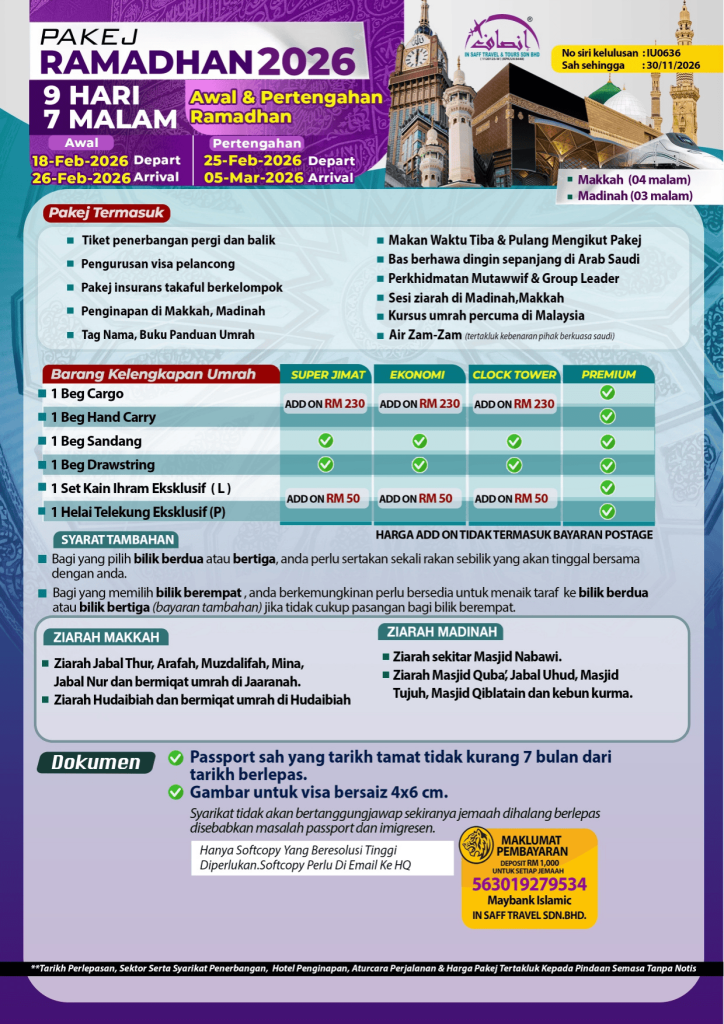 Rasai pengalaman luar biasa di Tanah Suci dengan Pakej Umrah Ambang Ramadan bersama In Saff Travel & Tours Sdn. Bhd.! Pakej ini menawarkan peluang unik untuk memulakan Ramadan di lokasi penuh keberkatan.