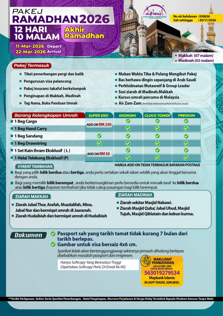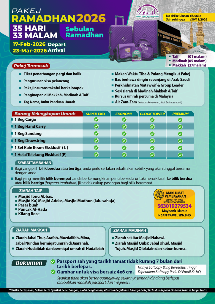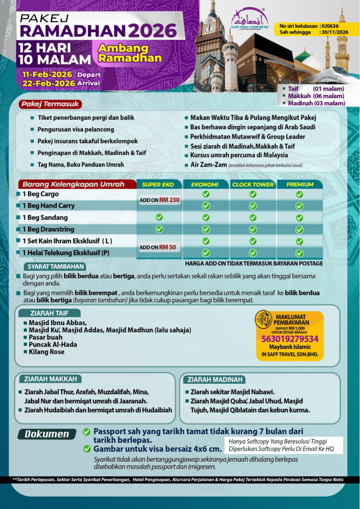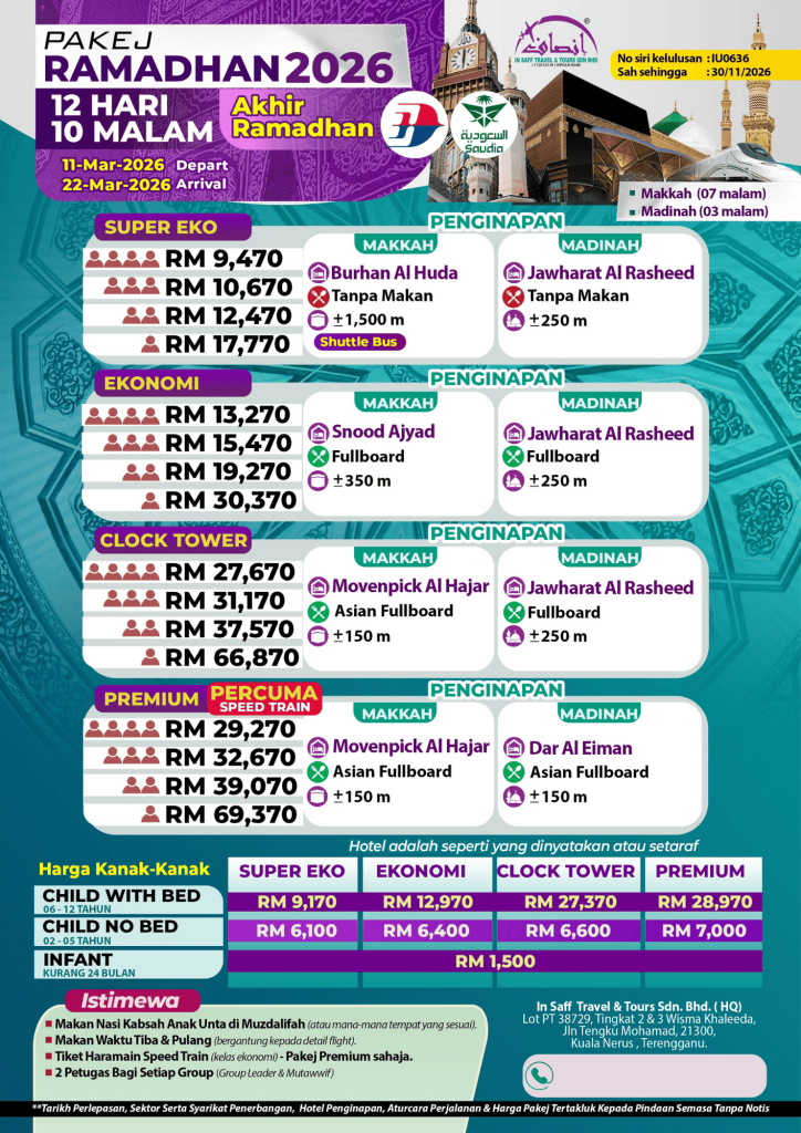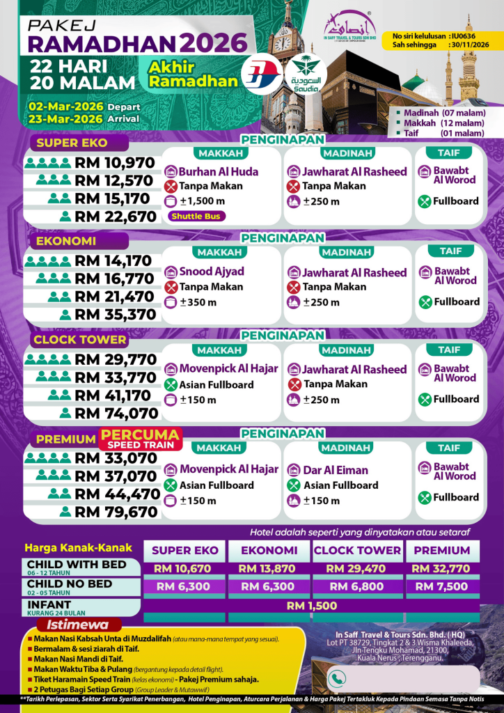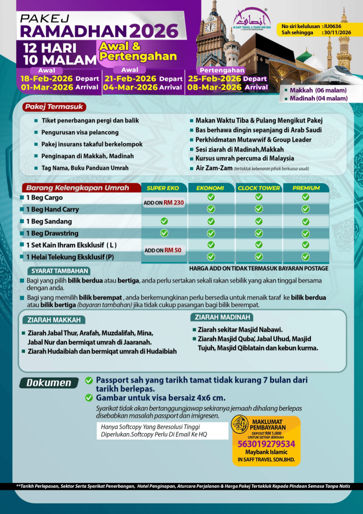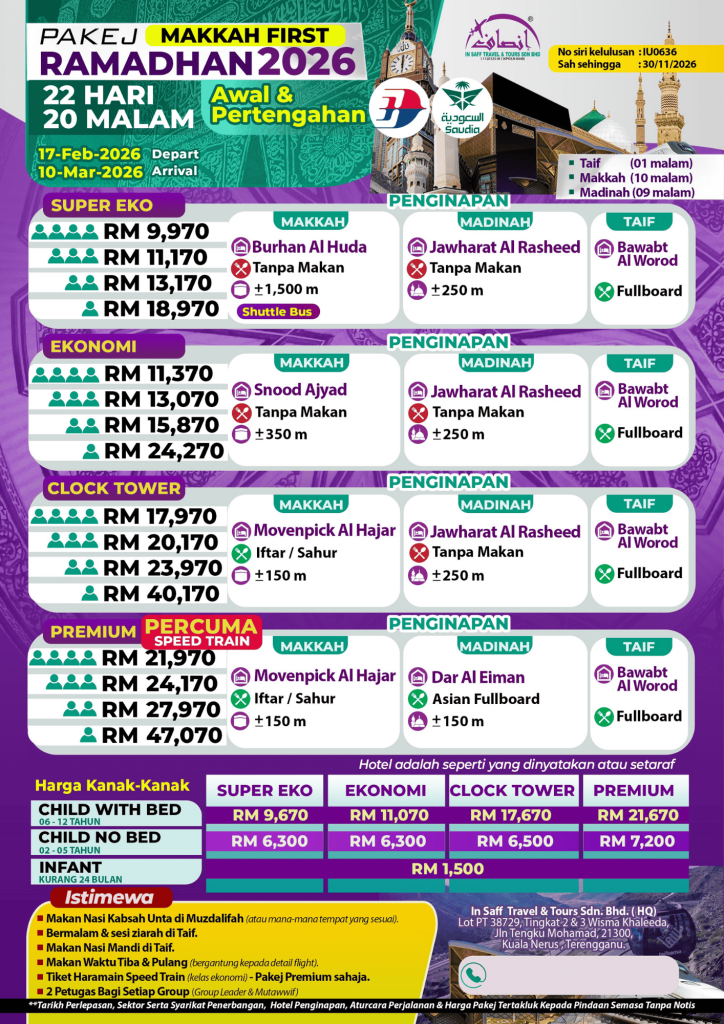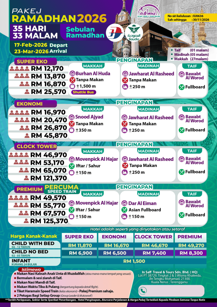Rasai pengalaman luar biasa di Tanah Suci dengan Pakej Umrah Ambang Ramadan bersama In Saff Travel & Tours Sdn. Bhd.! Pakej ini menawarkan peluang unik untuk memulakan Ramadan di lokasi penuh keberkatan.