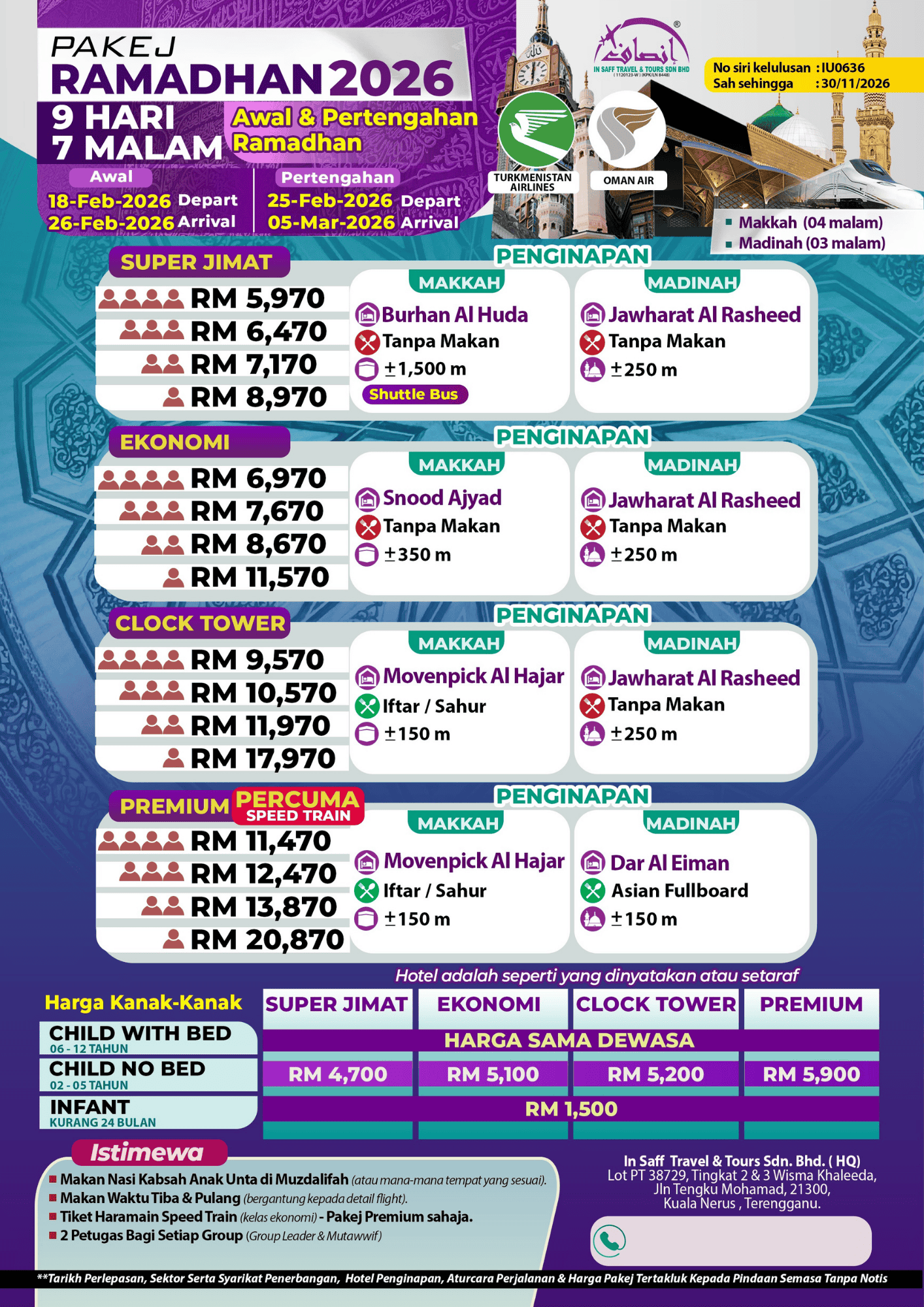 Mulakan Ramadan anda di Tanah Suci dengan Pakej Umrah Awal Ramadan 1447H bersama In Saff Travel & Tours Sdn. Bhd.. Nikmati pengalaman beribadah dalam suasana penuh ketenangan selama 12 hari, dengan pelbagai pilihan pakej mengikut bajet dan keselesaan anda.